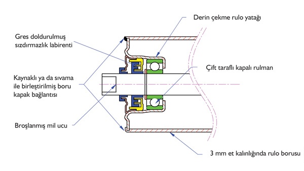 Kullanilan rulmanlar “omur boyu sizdirmaz” sekilde cift kapakli secilmis olup, bakima ihtiyac duymazlar. Rulmanin onunde ise hem ici gres dolu labirent kece hem de disarida toz kapagi kullanilarak cift kademe sizdirmazlik saglanmistir.